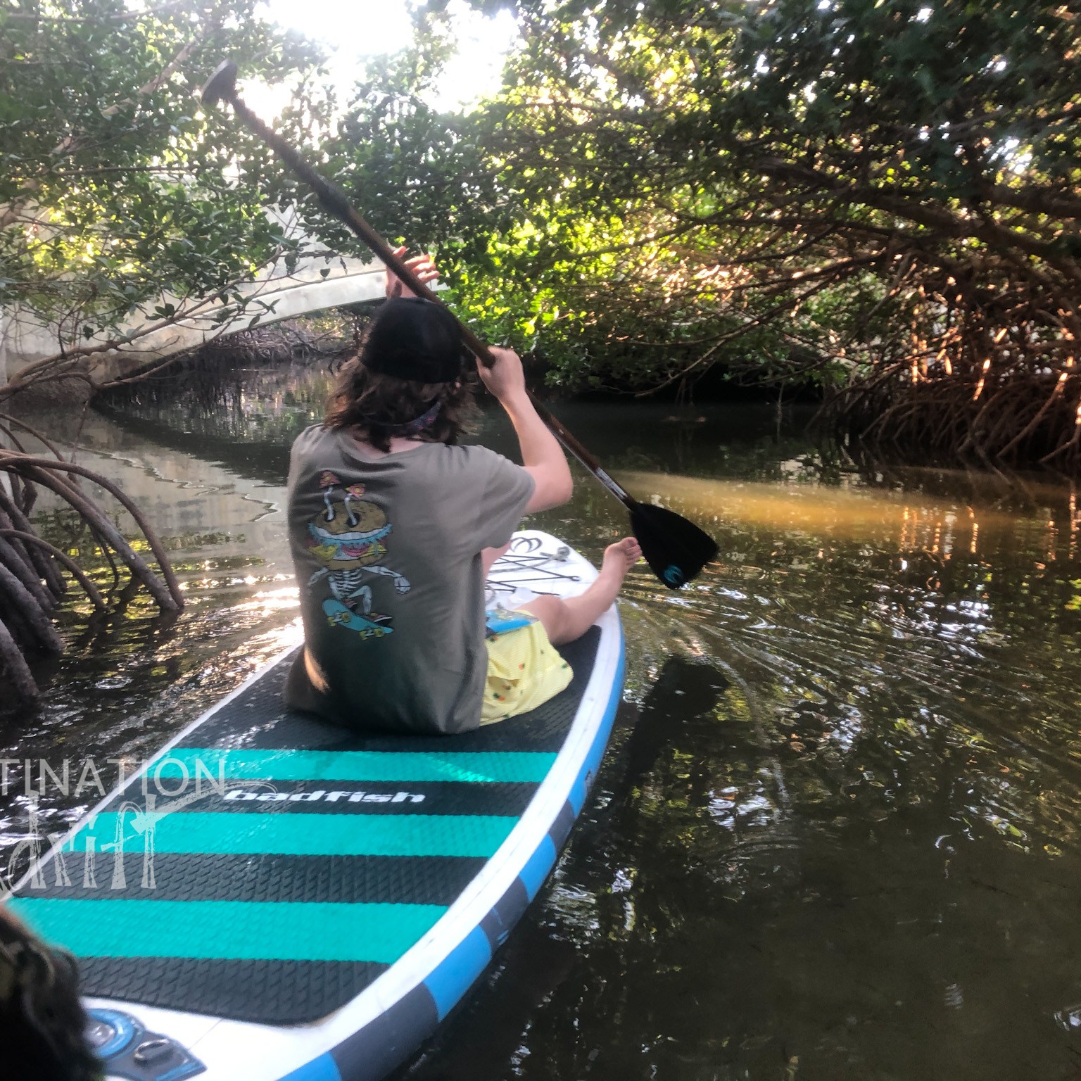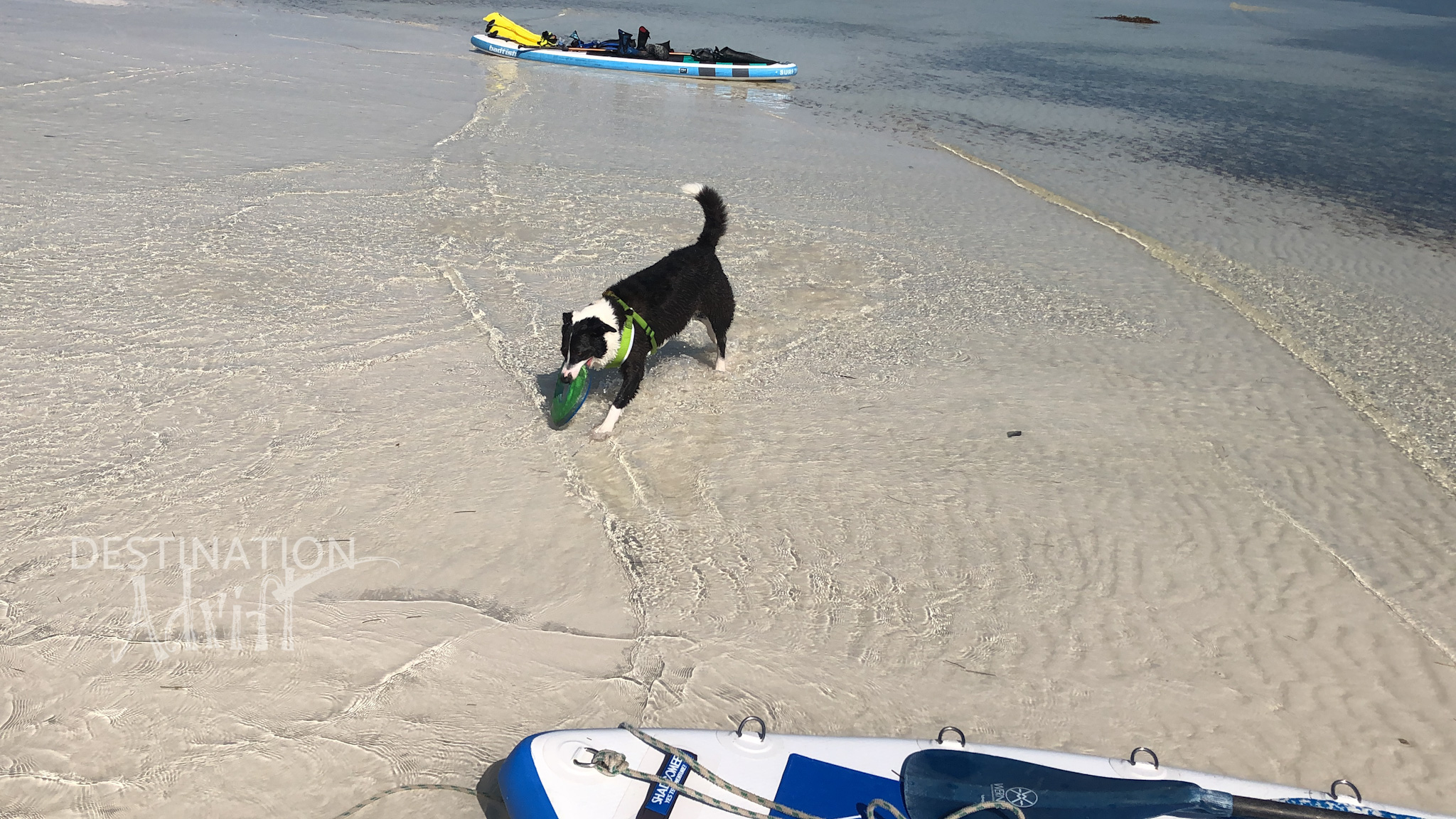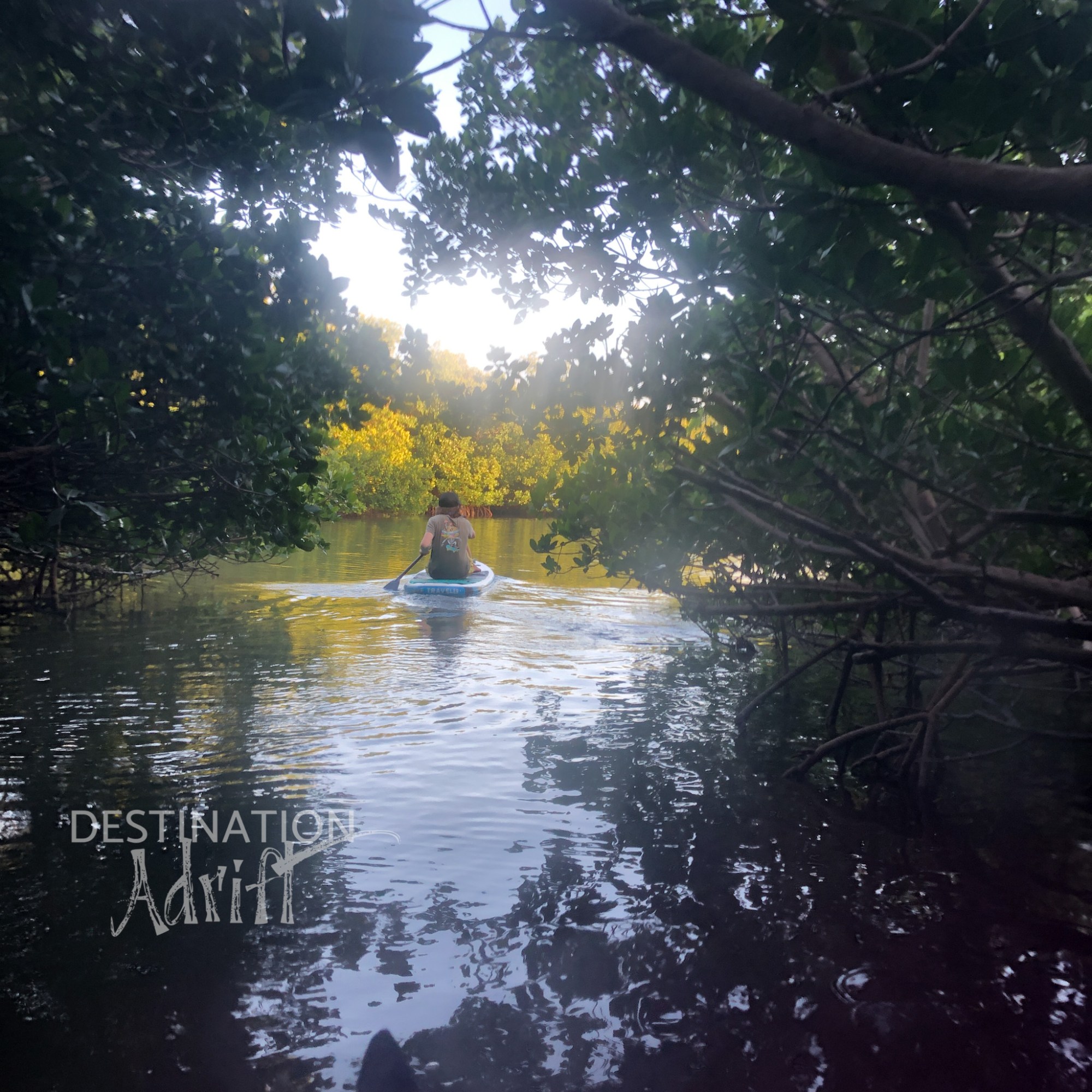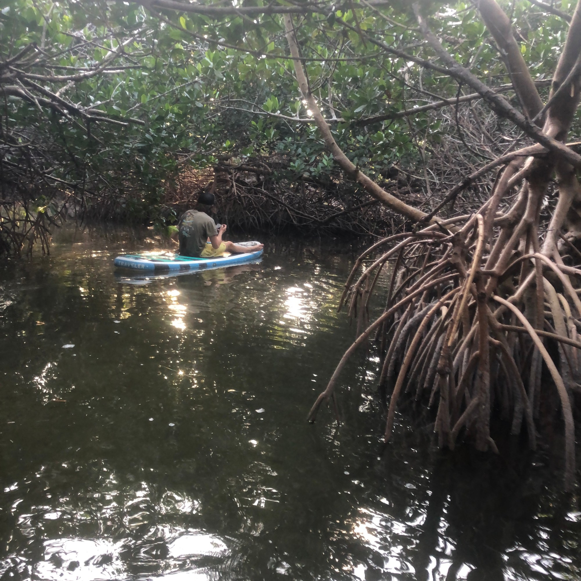 Once we got through the inlet, it was fairly easy to find a spot in the cove. There were only two other boats so we all had about a third of the cove to ourselves. The depth of this area is listed on charts at 6-8ft and we found it to be about 6’ total depth with 2’ still under our keel at low tide. As soon as we found a spot to anchor, we dropped in the SUP boards and headed for a hidden opening in the mangroves. Upon first glance, you don’t even know it’s there…but if you watch for awhile…you’ll start to see kayakers and paddle boarders appear out of nowhere! We had to check this out, it was another suggestion from our marina neighbors on M/Y Willow. Off we went, Cody on the board in front, Bella, Steve and I all on one board! While this does make the case for us to invest in another SUP board, I will say…the board we do have is amazing since it can hold all three of us well! This little section of the mangrove paddling trail is about 1.5-miles and circumnavigates Little Crawl Key. It takes approximately one hour and features a mangrove tunnel, deep water lagoon, grassy flats, sandbars and open ocean. There is also a longer route that is 5 miles long, and yet an even LONGER route that connects to the Florida Circumnavigational Saltwater Paddling Trail!