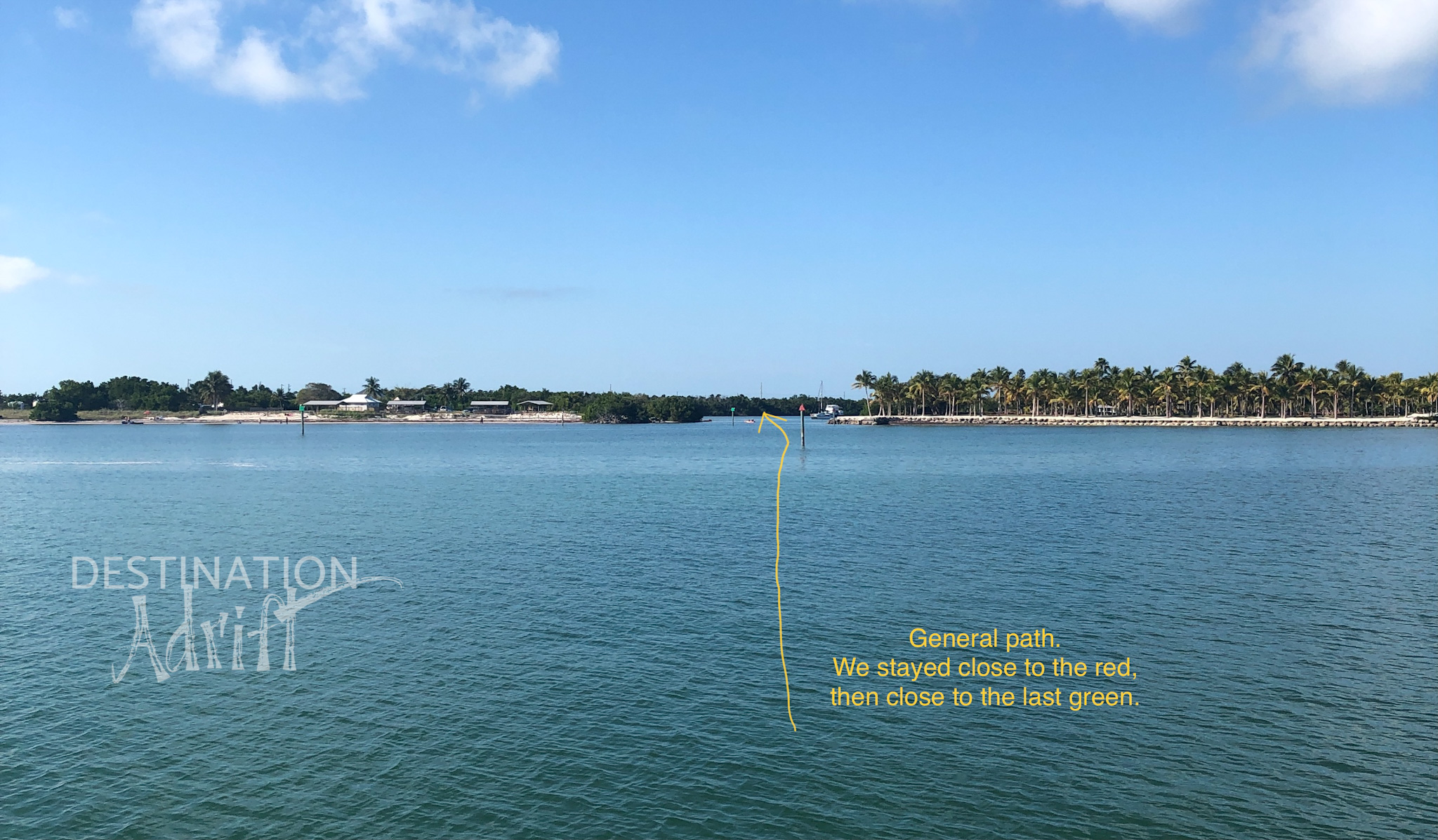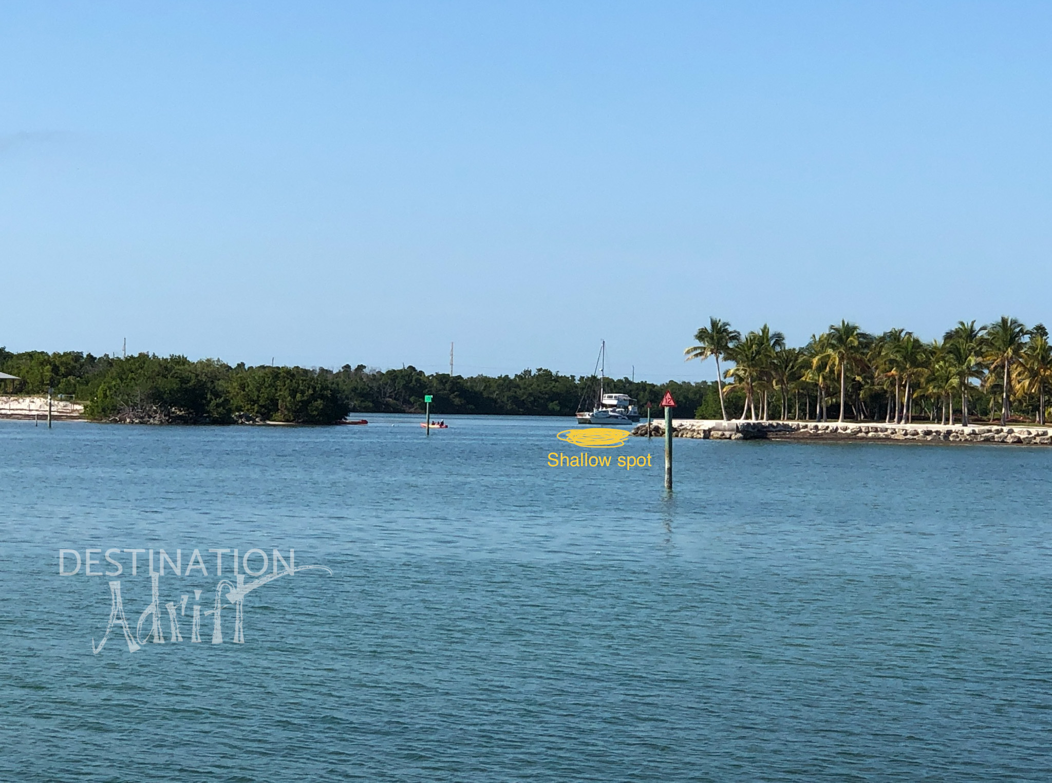 Once we were done playing and snorkeling around the sandbar, we decided to try our best to get into the anchorage. It wasn’t quite high tide yet but we (read: Captain Steve) were confident in the boat making it in there ok. Luckily, the channel markers to get in are located at the sandbar so we didn’t have to go far. The channel is an odd shape, I’d describe it as an “S” shape. Some markers are missing and we noticed our chart plotter was “off” and not showing us lined up with the markers in real life. We stuck close to the red markers which is suggested in reviews of this area. The only marker we didn’t stay close to was the last red one due to some shoaling and shallow water near the shore.